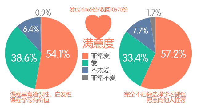 在世界MOOCs浪潮下,如何直观体现课程质量和学习效果?为此,在课程结束时,智慧树网从课程目标、课程内容等方面做了调研。调查问卷发放给所有选修学生,共16465份,回收10970份,回收率近70%。通过“非常满意、满意、不太满意、非常不满意”四个维度的数据反馈情况来看,满意率分别高达92.7%、90.6%。具体显示如下: