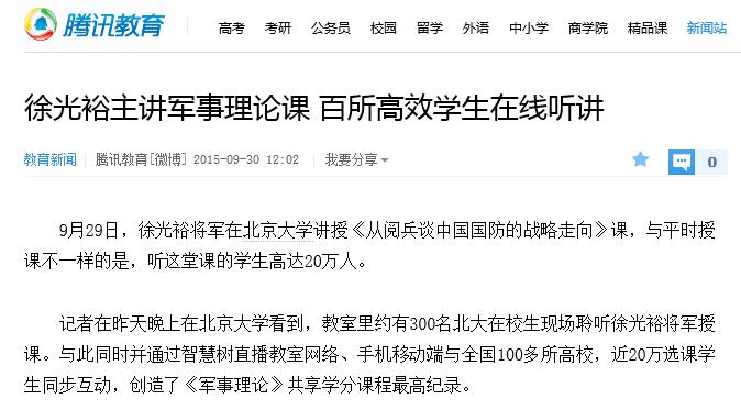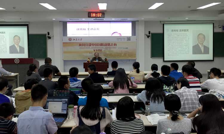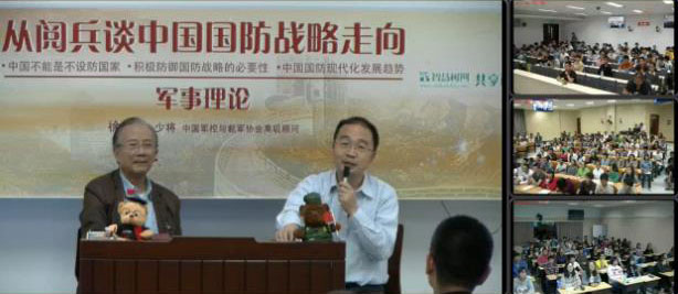 9月29日,在国庆六十六周年庆典将至之时,中国军控与裁军协会高级顾问徐光裕将军莅临北京大学,从大阅兵谈中国国防战略走向,通过跨校直播与将军互动交流的学生高达20万人,“80后”将军和95后学生在年龄上有距离,但在国家大事上丝毫不存在代沟。本次见面课引起新浪、腾讯等主流媒体争相报道。